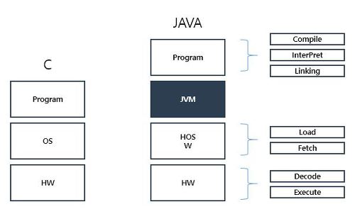 - JVM은 JavaVirtual Machine의 줄임말로 wirte once, run erveywhere 즉 OS마다 따로 코드를 작성해야 하는 번거로움 업이 Java가 플랫폼에 독립적일 수 있게 만들어준다. 예를 들어 C 프로그램은 바로 기계어로 컴파일하므로 HW 기종에 맞게 컴파일되어야 한다. 이를 '플랫폼에 종속적'이다. 라고 한다. 반면 Java 프로그램은 중간 단계 언어로 컴파일하여 JVM만 각 OS만 설치되어 있다면 HW 기종에 상관없이 단 한 번만 컴파일하면 된다. 이를 '플랫폼에 독립적'이라고 한다. 간단히 말해 JVM은 Java 클래스 파일을 로드하고 바이트 코드를 해석하며, 메모리 등의 자원을 할당하고 관리하며 정보를 처리하는 작업을 하는 프로그램이다.